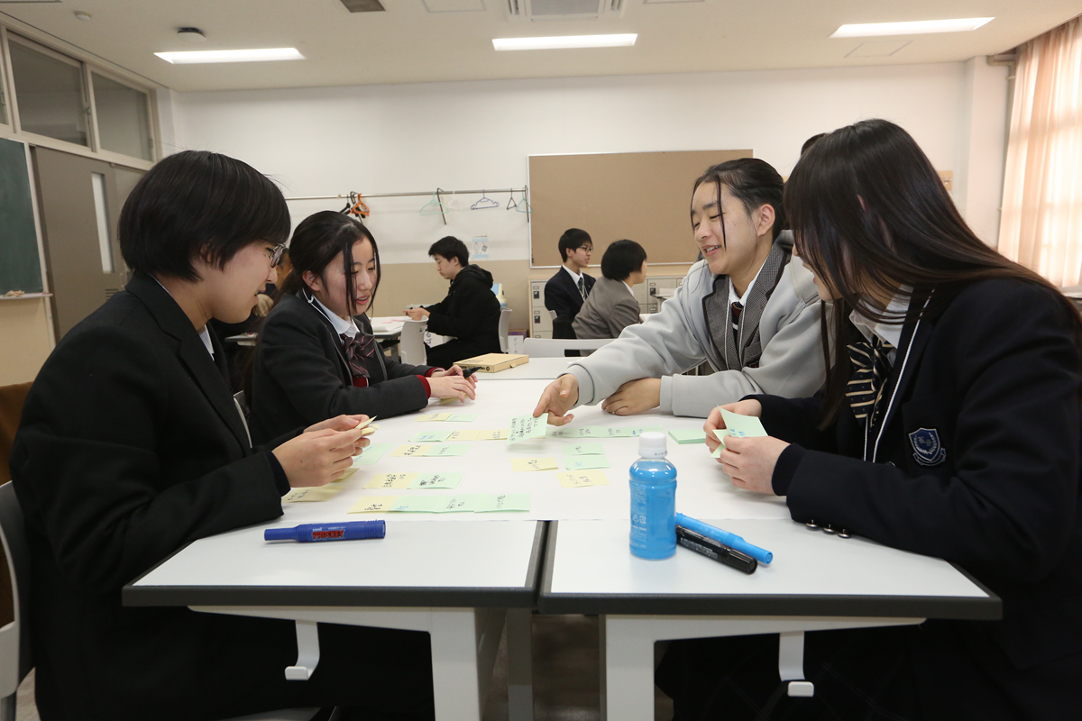 それぞれの学校の校則について付箋を用いながらシェアをし、何が不合理なのか、という不合理の概念について話し合う中で不合理な校則を判断し、