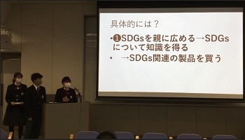 SDGsの中で関心のあるテーマごとに集まり、グループで訪れてみたいフィールドワーク先の情報を発表している様子