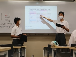中間発表の振り返り。発表時の質疑応答で出た疑問点や、自分たちの発表動画を見直し、観点の再解釈と再構築をする