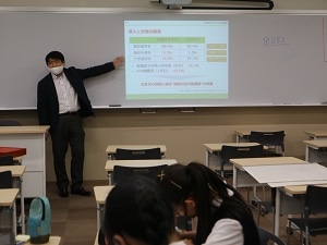 →能島さんから生徒に発題(格差の背景を問う内容)をして頂き、ペアで意見交換、その後指名されたものが答える→それを受けてレクチャー継続。の形式。