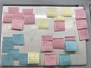 ①グルーピング;まなぼーどに、それぞれの付箋を張り付けていく。(同じ要因は重ねて貼る。近い要因は近くに貼る。遠い要因は遠くに貼る。)