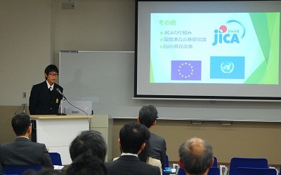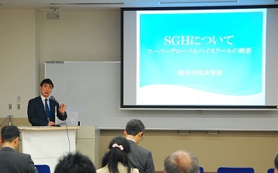 午前は関西学院院長・高中部長のルース・M・グルーベル先生より「グローバル教育」についてお話しいただき、その後、1年間行ったイベントについて、スライドを用いて、副部長の松浦克博先生より説明して頂きました。