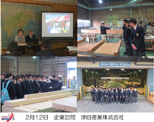 世界30か国から木材の輸入・販売を行っている津田産業では世界の森林の状況、日本の企業と海外の企業の関わり方に関してお話を伺いました。その後、工場も見学させていただき、家の骨組みが出来る過程を学ぶ事が出来ました。