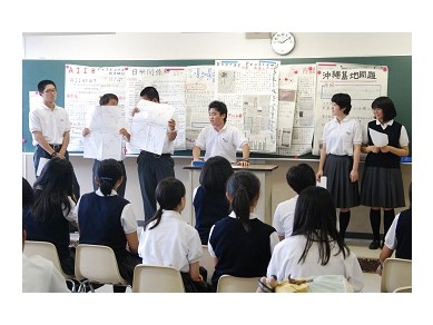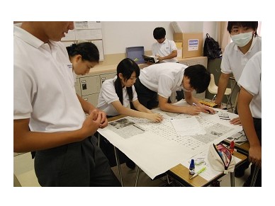 グローバルポスターセッションは、今年度から開始された新しいプログラムです。 1年生9クラス全員が対象で、6月からクラス内でグループごとに関心のあるグローバルなテーマを決定します。複数の新聞社の記事を読み比べながら調査し、手描きのポスターを作成しました。