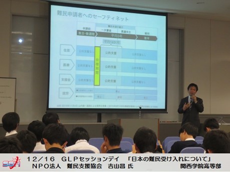 12月16日(水)GLP生徒全員を対象に、NPO法人難民支援協会の吉山昌氏を講師としてGLPセッションデイを行いました。テーマは「日本の難民受け入れ」。難民についての基礎知識から、日本における難民受け入れの現状、またその支援や対策などについて学びました。難民を受け入れるべきか否か、という問いには生徒間でも賛否両論あり、あらゆる視点から意見交換をおこない、その打開策についても話し合いました。