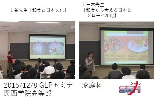 12月8日(火)GLP2・3年生を対象に家庭科の谷先生と社会科の三木先生を講師として、GLPセミナーを行いました。テーマは「和食」。前半は谷先生に「和食と日本文化」についてお話ししていただきました。「和食」は2013年にユネスコ無形文化遺産に選ばれました。