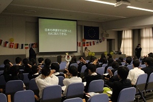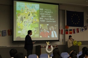 大阪ドイツ文化センターより館長のRainer Manke氏にお越しいただき、主にドイツの文化・各地方に関する基礎知識や魅力、EUの歴史と役割・活動についてご説明いただきました。また、EUにおけるドイツの役割や責任に関して、とりわけ多文化共生やヨーロッパの難民問題について述べられました。