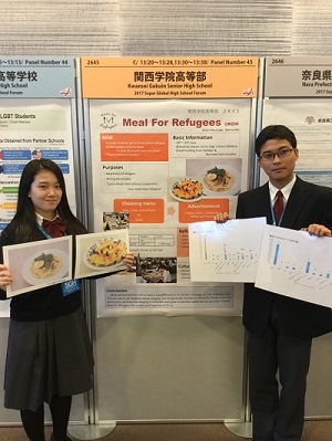 11月25日(土)パシフィコ横浜にて開催されたSGH全国高校生フォーラムに、本校のGLP3年生2名が参加しました。このフォーラムは、全国の高校生に研究成果を発信する場を与え、「今後の課題研究の深化や意欲の向上を図ること」を目的とされています。当日は、全国のSGH指定校およびSGHアソシエイト校から集結した高校生たちによるポスターセッションなどが実施され、本校生徒も英語によるプレゼンテーションを行いました。フォーラムに参加したGLP3年生の松永くんと三木さんは、6月20日の「世界難民の日」(World Refugee Day)にちなんで本校食堂にて開催した、在日難民の出身国料理を提供する「Meal for Refugees(M4R)」について、その実施報告と成果をポスターにまとめて発表しました。これまでのGLP活動の集大成ともなる成果発表の機会を与えられ、またそれぞれの課題に真摯に取組む同年代の高校生から沢山の刺激を受け、大変有意義な時間を過ごすことができました。