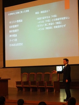 12月13日(木)東北学院大学教養学部准教授の松谷基和氏をお招きし、「福島から世界へ ~その旅路を導く杖~」というテーマで全校生徒を対象にGGPグローバルセミナーを開催しました。幼少期から海外とは馴染み深かったというご自身の経験やキリスト教との関わりについて、また小・中学生の頃は「方言」に関心を抱き、スピーチコンテストで「福島弁」について英語で発表し入賞したことなど、高校生にも共感できるエピソードを交えながらお話しくださいました。