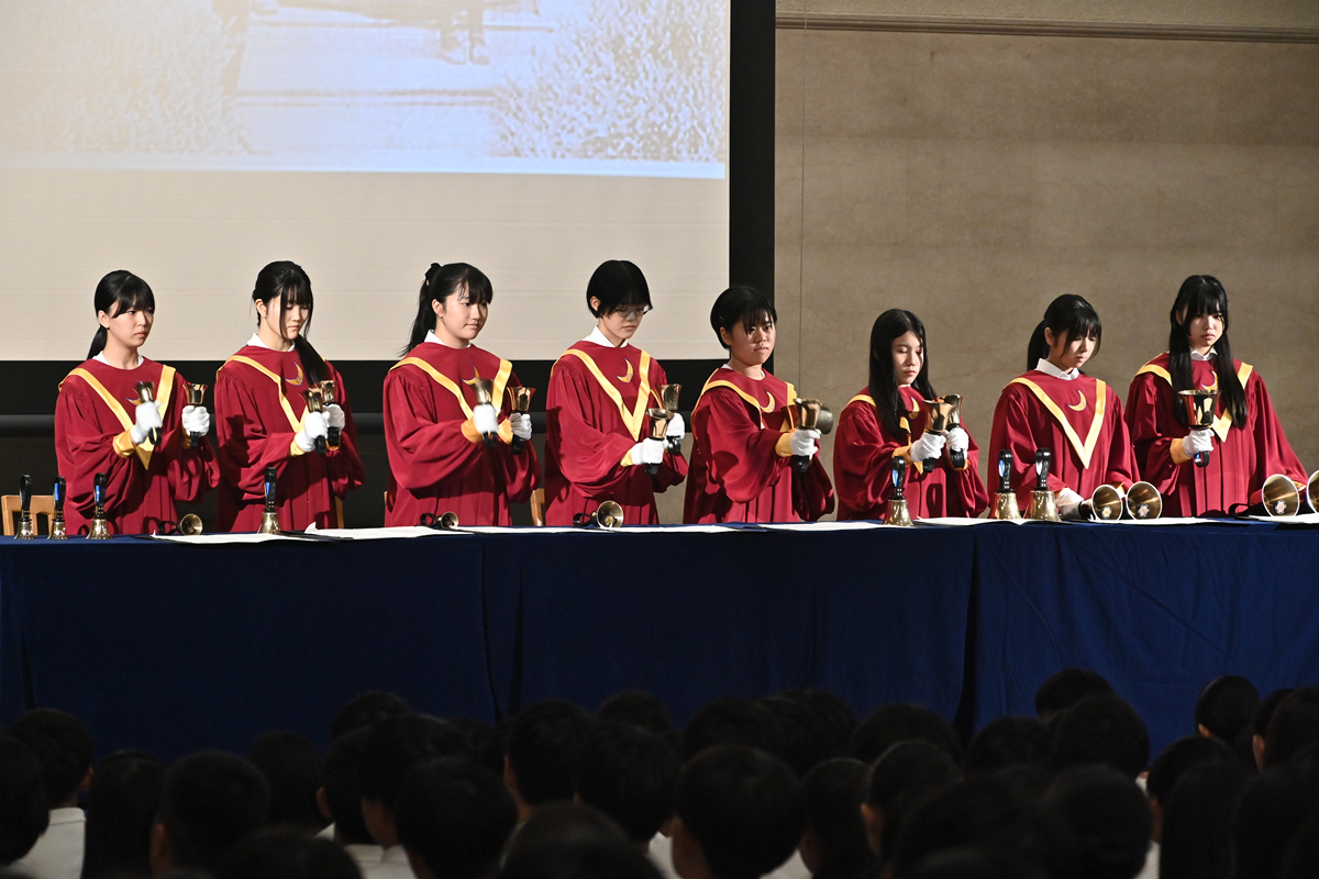 宗教部には行事・研究・ハンドベルの3つの班があります。行事班は礼拝の司会や宗教行事の企画・運営を行います。今年はイースター・エッグハントをしました。研究班は、テーマを決めて研究をします。今年は「キリシタン大名と和歌」というテーマで、特に「蒲生氏郷」を研究しています。研修旅行やフィールドワークに出かけます。ハンドベル班は、クリスマス礼拝や創立記念礼拝などの式典で特別さんびをします。